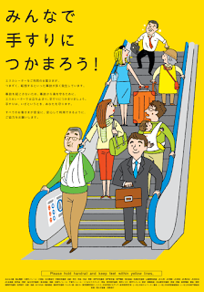 さて、2015年7月21日から「みんで手すりにつかまろう!」というエスカレーターのキャンペーンが始まったことに私は心から喜んでいます。このポスターにあるように、エスカレーターの転倒事故は非常に危険だと思っているからです。特に危険なのはポスターに描かれている下りでしょうね。エスカレーターを歩いたり走ったりしている人たちは、その危険性を理解していないのだろうと思うのですが、転倒したら巻き添えになる人が出て怪我をするのは自分一人だけではないことを意識すべきです。